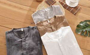 Vintage Stand Collar Linen Shirt - Mid Sleeve
